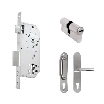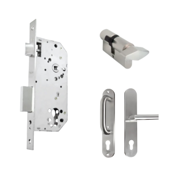 Kit Cerradura de Embutir 50mm + Manija Turín con Escudo y Jaladera + Cilindro Llave-Llave o Mariposa